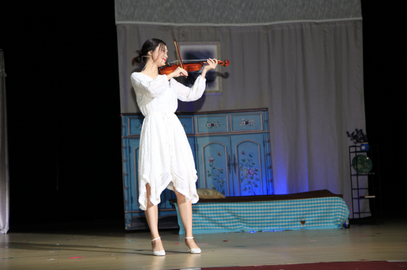 以小提琴声开始,以小提琴声结束,整个戏剧的背景音乐运用得恰到好处,无论是高贵优雅的华尔兹配乐,还是劳拉爱情破灭后的暴雨声,都将现场观众带入到了情境之中。而劳拉在最后的自述以及现实与回忆的交织更使整场戏剧迎来了高潮。舞台一角蓝色灯光下是现实中的劳拉,舞台中央是回忆中的劳拉,二人的小提琴声同时响起,戏剧《玻璃动物园》也走向了结束。