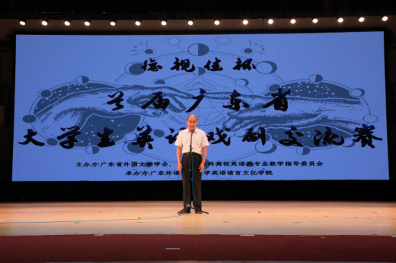 随后,广东外语外贸大学英语语言文化学院院长、广东省高校英语教育指导委员会主任温宾利教授,代表主办方和承办方致辞。他高度评价了本次大赛的演出和组织水准,并指出,从高校英语教育角度来看,戏剧是重要的教育方式,是“寓教于乐”,“做中学”的有效手段。他热烈祝贺本次大赛圆满成功,并期望大赛今后继续开展下去,推动戏剧文化和人文精神的成长。