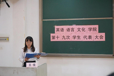 (右图)英文团委副书记王佳同学作工作报告