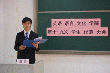(右图)学生会主席夏雷作第十八届学生会工作报告