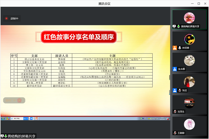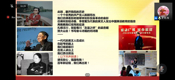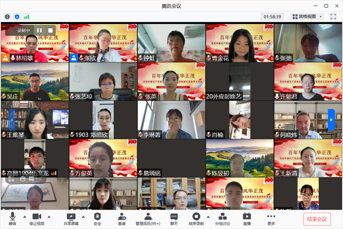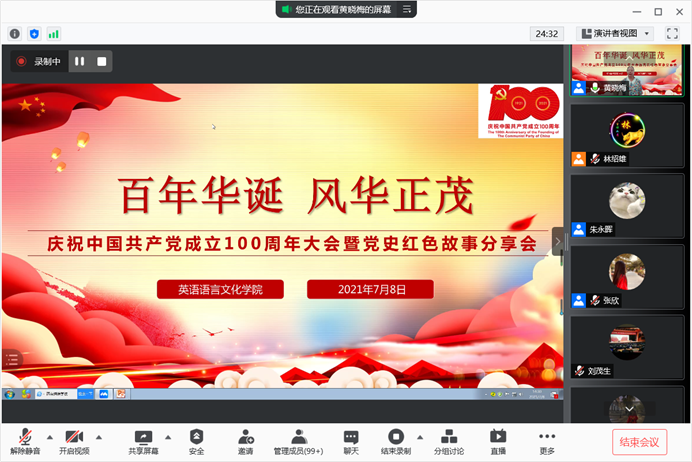 为庆祝中国共产党成立100周年,激励全院党员和师生学党史、悟思想、办实事、开新局,2021年7月8日下午,广东外语外贸大学英语语言文化学院党委通过腾讯会议平台,成功举办了庆祝中国共产党成立100周年大会暨党史红色故事分享会。会上,学院党委书记林绍雄为中国共产党成立100周年致辞,各支部党员代表先后分享了一段党史红色故事,学院党委副书记、院长张欣作总结讲话。大会由学院党委副书记黄晓梅主持,全体共产党员、发展对象和入党积极分子近300人线上参加了本次活动。