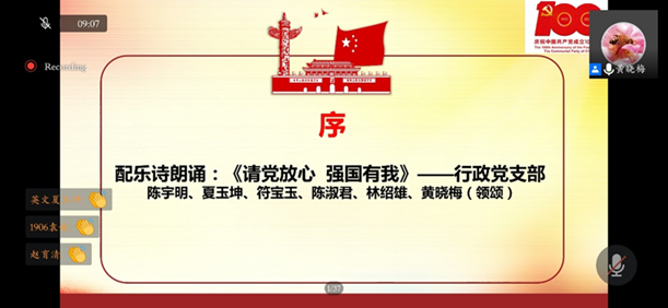 在红色故事分享环节,行政党支部党员首先为中国共产党成立100周年献上配乐诗朗诵《请党放心,强国有我》,抒发了bevictor伟德全体师生继往开来,为祖国书写奋斗诗篇的责任担当和郑重承诺。