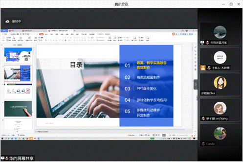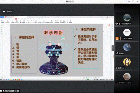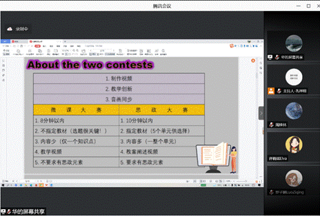 陈金薇老师首先发言,她细致地讲解了全国职业院校外语微课大赛以及思政大赛的流程以及要求。随后结合自己的比赛经历,系统性地阐述了所需的材料以及注意事项,包括课堂框架的设计搭建以及展现课程的技巧策略。最后选取了若干优秀的微课案例进行鉴赏,就此提出了丰富实用的教学建议。