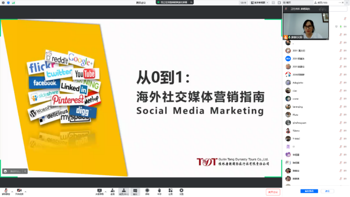 奉春英老师作为现任唐朝国旅营销部新媒体业务推广经理,负责唐朝国旅旗下“Odynovo”品牌的社交媒体推广、视频营销、第三方平台合作等业务。奉春英老师从海外主流新媒体运营平台、媒体运营和营销方法、社交媒体平台如何扩充粉丝量等角度阐述了一些主流媒体的运营经验,让同学们听得回味无穷,津津乐道。此外,奉春英老师分享了诸多视频制作、营销方面及第三方平台的见解,帮助同学们深刻地认识和了解社媒营销的方法和规则。
