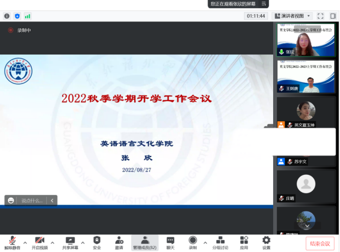 张欣就新学期文化建设、学科专业建设和新教材引进落地等工作进行了整体部署。她由暑假期间备受关注的社会事件入手,探讨了在当下“百年不遇之大变局”的形势下,以变应变。同时,传达了8月《理解当代中国》英语系列教材教学研讨会、教育部新文科建设工作组广东省调研工作会的会议精神,让教师队伍更加充分认识“三进”工作的重要意义,更好地落实《理解当代中国》英语系列本科教材的使用工作,确保将习近平新时代中国特色社会主义思想更好地融入英语专业的人才培养和教研科研工作中。会上,张欣借用两段短视频,引出当下外语专业课程体系中普遍存在的“当代中国缺席症”,以及央视记者刘欣在接受国外专访采访实录时所展现的作为英语专业人才最美的模样,进一步说明了教育要回应时代之需、培养时代新人的重要性。最后,她对本学期几项重要工作进行部署,强调教学工作注意事项,提出了学院发展的新思路。