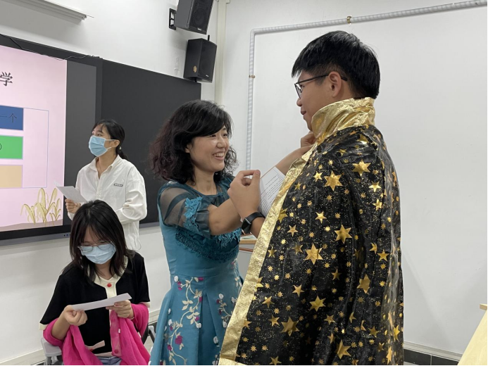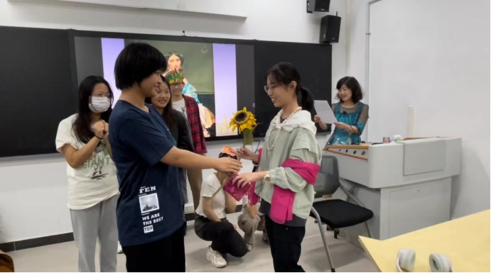 最后,来到本节课的重头戏,小剧场环节。张兰老师认为以演促学的教学形式对于本次戏剧教学是最为有益的。于是,她把全班30位同学分成了四个小组,给每个小组分配了戏剧中的一个情节进行演绎。在这个环节中,全班同学都积极参与到戏剧演绎中来。尤其是当张兰老师把自己精心准备的道具一一分派给每个不同角色的同学时,全班更是一度“沸腾”。在张兰老师的精细分工以及细心指导下,各组的演绎顺利进行,全班气氛越演越热。
