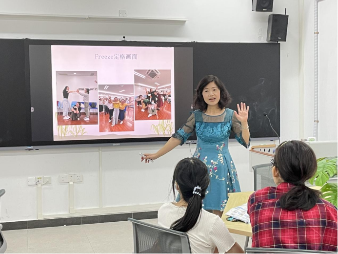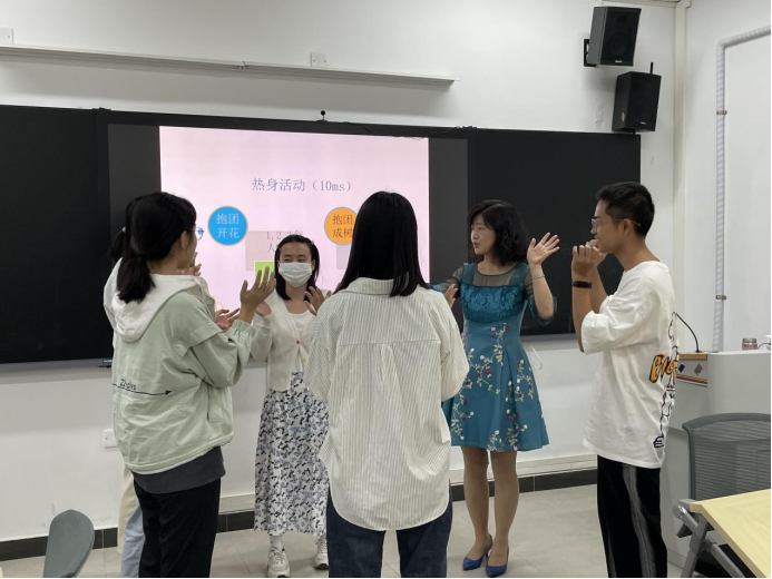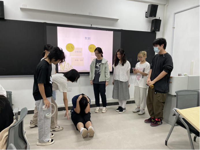 紧接着,张兰老师继续向同学们介绍教育戏剧的核心理念:重在参与,表明了戏剧参与的重要性,顺势教授同学们Freeze 定格表演作为本节课戏剧演出的热身运动。这些定格表演包括了抱团开花、抱团成树、演默剧等。同学们踊跃参与到这一系列的热身运动当中,玩得不亦乐乎。