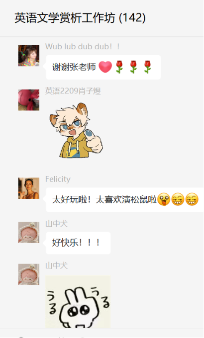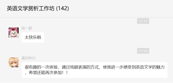 本次文学赏析工作坊让同学们纷纷表示受益匪浅。很多同学表示本次戏剧课堂非常有意思,还不断询问能否继续参与到下一次工作坊的课堂。不仅如此,部分同学课后还在文学赏析工作坊的微信群里大赞本次课程的体验,对于本次课程给予了肯定。”