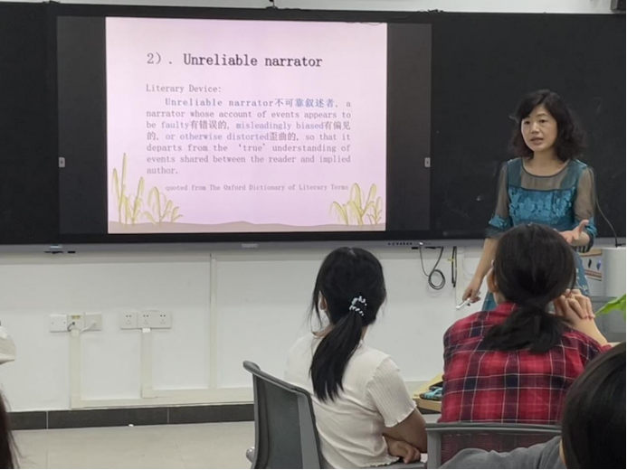 一轮讨论后,张兰老师为同学们进行了文本的讲解,并且引入了一个新的概念:不可靠叙述者(unreliable narrator)。而文中的主人公正是这样一位不可靠叙述者,他用一系列不可靠的逻辑去诋毁自己已逝的妻子,最后自然并不能得到读者的认同。张兰老师随后讲解,这正是戏剧反讽(dramatic irony)。