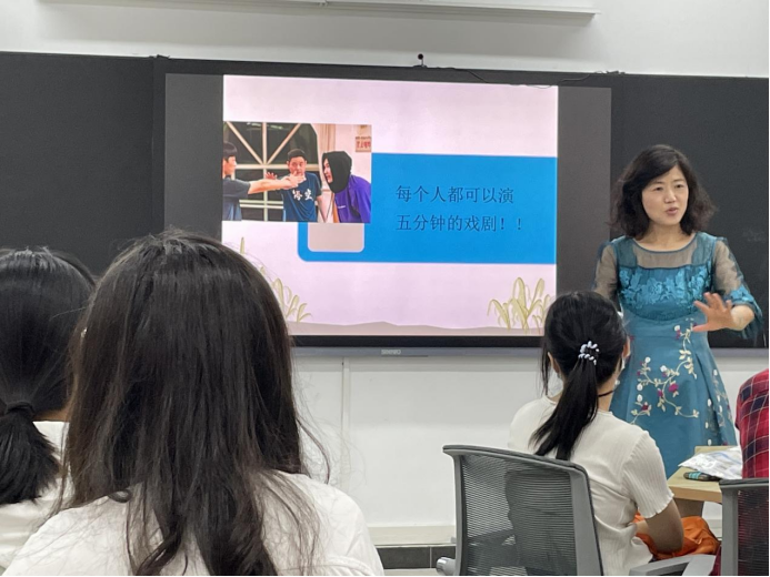 张兰老师首先向同学们介绍了戏剧《深夜小狗离奇事件》,讲述了自闭症主人公阿弗的故事,也讲解了阿弗扮演者如何运用一系列动作以及语言处理进行这一部戏剧的表演。借着对这部戏剧的简单讲解,张兰老师高效地和同学们科普了英文戏剧,大大吸引了同学们对于戏剧的兴趣。并说出了一句鼓舞人心的话语:每个人都可以演五分钟的戏剧!