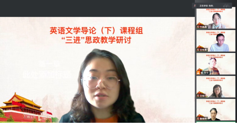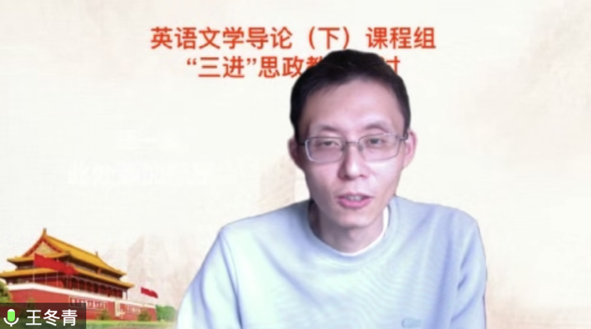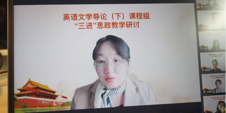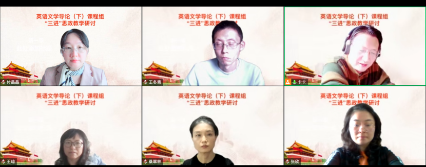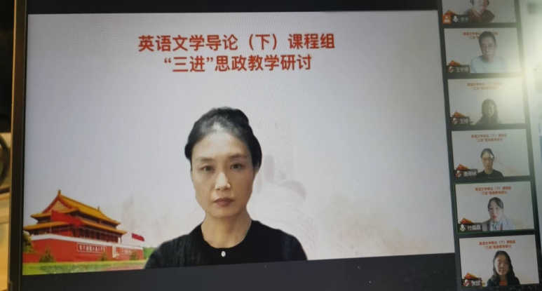 本次英语文学导论(下)课程组的“三进”思政教学研讨热烈,与会老师肯定了研讨的必要,并表示会继续探索日常教学与“三进教育”的具体结合点,灵活而不呆板,全面而非片面地继续探索新的教学方法,培养新的教学理念,从而赋予自己的教学以崭新的时代内容。