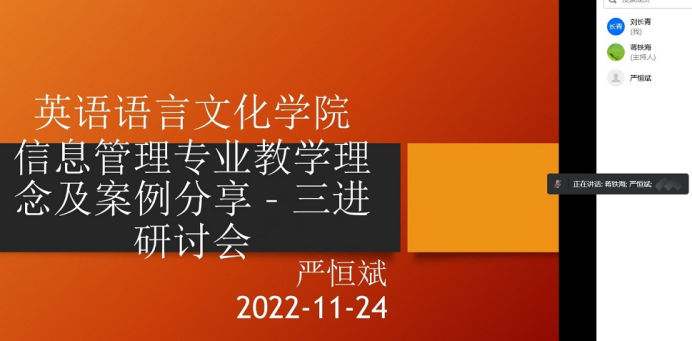 严恒斌老师发言的题目是“信息管理专业教学理念及案例分享”。严老师从以下几个方面分享自己开展思政教育的体会。