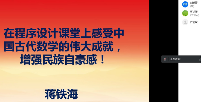 蒋铁海老师以程序设计课堂上的循环语句中的经典题目为例,提到除了让学生在程序设计课堂上掌握循环语句的规则和应用,更能感受中国古代数学的伟大成就,增强民族自豪感!几乎所有的程序设计语言都要到循环语句。我们在讲授循环语句的实例的时候拿什么作为实例为好呢?其实,中国古代数学中的“百钱买百鸡”、“物不知数”的求解就是最好的实例!不仅因为这些实例大家耳熟能详,而且它们也是循环语句应用的典型实例。