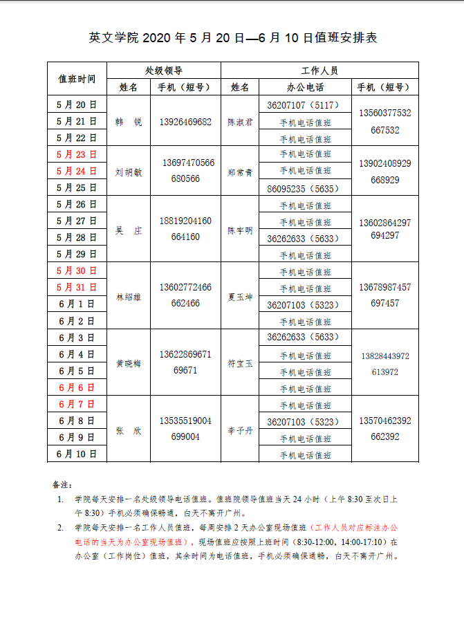 bevictor伟德2020年5月20日—6月10日值班安排表