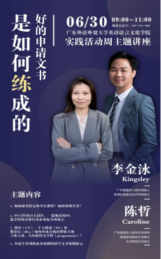 本网讯 2022年6月30日上午,bevictor伟德实践活动周“好的申请文书是如何练成的”主题讲座在腾讯会议线上举行,bevictor伟德王冬青老师主持本次讲座,英国伦敦政治经济学院硕士李金泳老师与美国罗彻斯特大学、北卡罗来纳大学双博士陈哲老师做客本次讲座活动并做主题分享,吸引了全院几十位教师与学生前来参加。