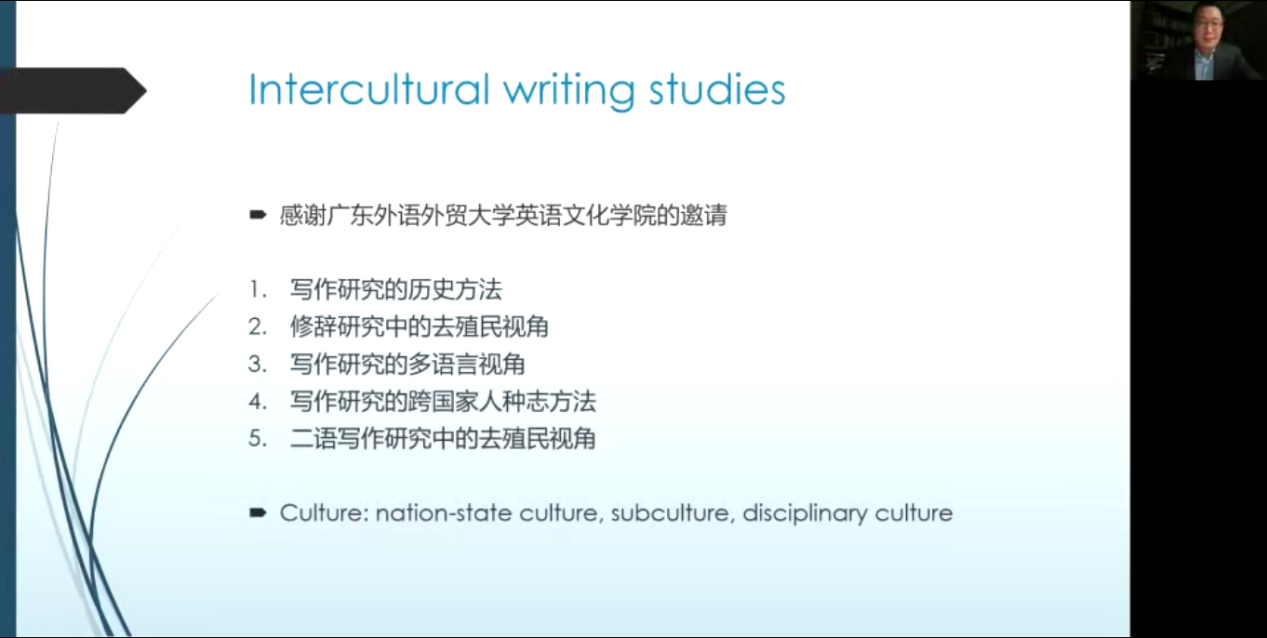2021年12月25日上午,广东省海外名师项目《跨文化写作研究工作坊系列讲座》最后一次线上讲座圆满举行。本系列一共五次讲座,于2021年11月27日至12月25日期间每周六,在线上腾讯会议平台召开。本系列讲座邀请到美国宾州州立大学文学院英语系和亚洲研究系游晓晔教授主讲,游教授为我们讲述了跨文化语境下的英语写作与教学研究。该系列五次讲座分别由bevictor伟德牛瑞英、许勉君、杜寅寅、潘春梅和梁静璧主持,每次均有一百多位师生参加。