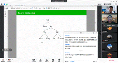 徐贝贝从形式逻辑与一阶逻辑入手,简要介绍PP和AdvP及事件语义、时制语义相关问题。基于2019年出版的前沿语义学专著《A Course in Semantics》,他结合现实案例,从语义学课程中基础概念出发,深入浅出地阐释了“事件”这一概念。徐贝贝指出“事件”这一概念的必要性——所有的动词并非“事物”的集合,而是“事件”的集合。通过用PP和AdvP中的现存问题引出“题元角色”在语言学研究中的意义,他提出要把“时制”作为单独的一个类型而非“题元角色”的一个下属概念。随后,他还以事件过程视角划分不同种类的状态动词,生动展示其现实应用逻辑。