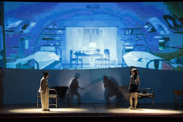 该剧目以小见大,以一个家庭的缩影折射整个人类社会。因此,配合故事叙述,舞台设计将科幻与温馨相结合,既符合未来设定,又能传达主题。剧目舞台设计十分精细,多数道具为手工制作。房间内的四朵以蓝紫色为主调的纸艺飞燕草花,既增添了家庭的温馨感,也突出了科幻感。该剧目追求动态呈现科幻题材,在背景和音效上融入科技元素;也追求戏剧美态表达,多次用花隐喻人类与机器人间的关系,为观众带来了一场极具美感的科幻视觉盛宴。