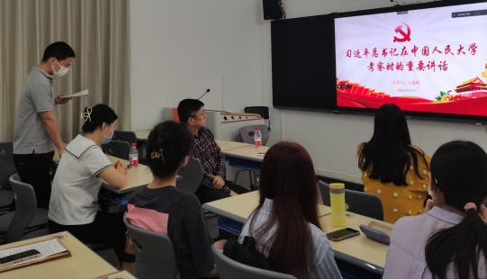 王蕴峰老师首先分享了学习心得。他从“为谁培养人、培养什么人、怎样培养人”教育根本问题出发,从学校、学生、师生以及课程四个维度进行讲述。一是学校层面应当体现中国独特的历史、文化及国情,要扎根中国大地,走出一条建设中国特色、世界一流大学的新路;二是广大学生坚定不移听党话跟党走,努力成长为堪当民族复兴重任的时代新人;三是广大师生应该积极发挥专业优势传播中国声音、中国理论、中国思想,从而为推动人类命运共同体作出贡献;四是思政课的本质是讲道理,要注重方式方法,老师要用心教,学生也应当用心悟,达到沟通心灵、启智润心的效果。