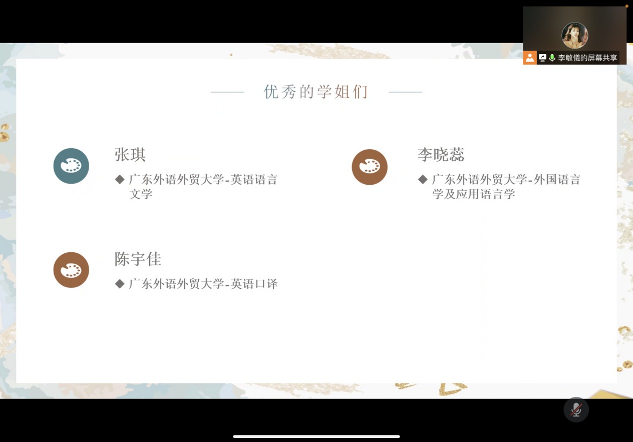成功上岸广外英语语言文学的张琪师姐、广外外国语言学及应用语言学的李晓蕊师姐以及广外高翻学院英语口译的陈宇佳师姐分别介绍了各自的考研专业,并从个人经历出发,分享了备考时间安排、复习经验以及在备考过程中遇到的困难和应对的措施。针对同学们想了解的问题,三位师姐细致讲解了各自专业的考研情况及其择校的经验,分享了如何平衡学业、实习与备考、备考过程中的心态和身体调整、公共课备考经验及参考书目等。张琪师姐详细地介绍了复习二外日语的计划以及使用的资料,并列出了专业课复习的参考书目。李晓蕊师姐从自身情况出发,提醒同学们“提前规划,预留时间;不要犹豫,说干就干;任务分割,精确到天”。陈宇佳师姐将政治、基英、翻译、百科四门考试细细剖析,全面讲解了每一门的题型、分值以及复习要点,罗列了众多获取复习资料的途径,并附上了有关择校和考研心态调整等方面的tips。
