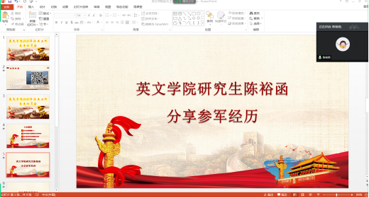 bevictor伟德18级研究生陈裕函分享了她的参军经历。她介绍了在部队中的集体生活、体能训练、专业训练和徒步行军等活动的经历,让同学们了解到了真实的部队生活。她认为:“当兵后悔两年,不当兵后悔一辈子,军营生活是人生宝贵的财富,同学们趁年轻应该去军营感受一下这种任何地方都没有的经历,两年的军营生活会磨练人的意志,提高人的自制力,并且让人收获珍贵的回忆和特殊的经历”。同学们向陈裕函师姐详细询问关于入伍、训练及晋升等问题。